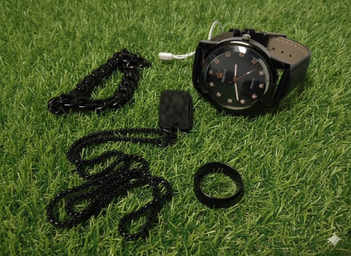 Upgrade your style with this Premium Black Men’s Gift Set, jisme shamil hai modern all-black watch, stylish chain, aur premium metal ring. Sleek design, strong build quality aur scratch-resistant finish isay daily wear ka perfect choice banati hai.
